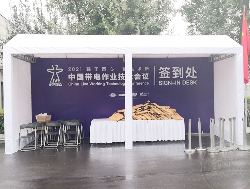 華熠鄭州篷房租賃公司以十多年的戶外搭建經驗,此次會議活動僅用了一天之內的時間就能把現場搭建完畢,省時省心又省力,更主要的是方便快捷,能夠給主辦方減少不必要的成本輸出,更好的能夠簡單而又不失內涵的體現在參會人員的面前。更好的完成中國帶電作業技術會議精彩開展。