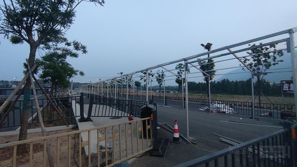 少林寺新停車場安檢篷房由鄭州篷房租賃廠家負責搭建,這顯示了華熠廠家在臨時建筑搭建領域的專業實力和豐富經驗。鄭州篷房租賃廠家以精湛的技術和優質的服務,為少林寺新停車場打造了一個安全、穩固且實用的安檢篷房。