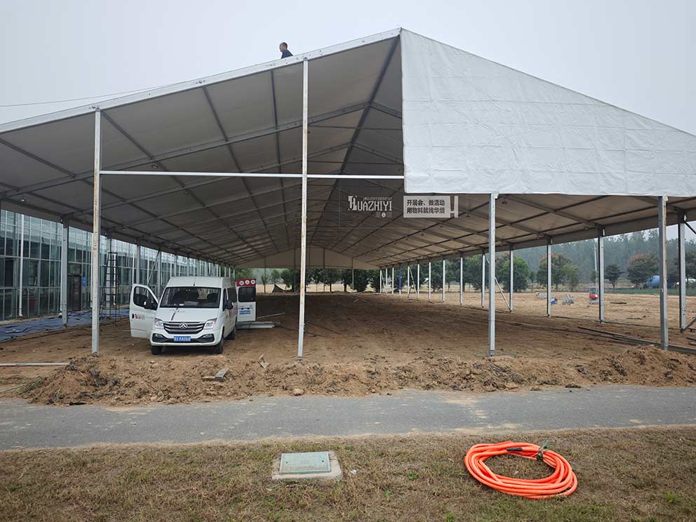 鄭州玻璃篷房租賃公司為中原地展搭建了一座展銷會篷房。鄭州華熠公司經常在各種活動上搭建篷房,例如車展,有時是婚禮,又或者演唱會安檢...可以說是多種類型多種材質,華熠公司都支持搭建。現在,中原地展的大跨度篷房也已經搭建完畢,一起來看看吧。