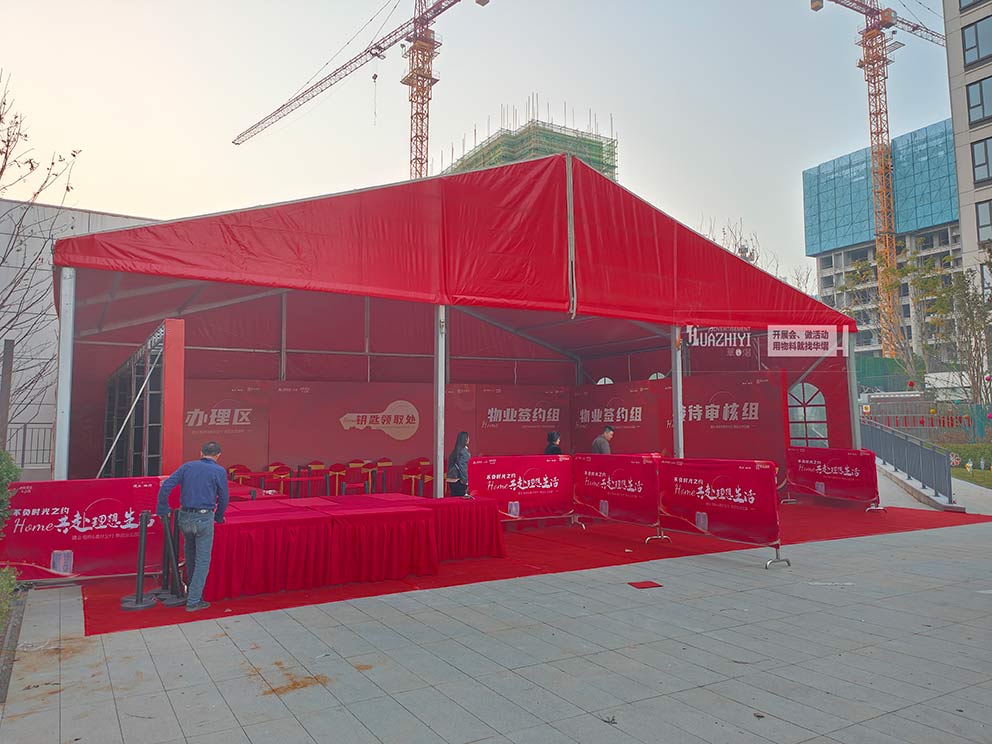 鄭州篷房租賃搭建交房現場紅色地產篷房。在山西晉城的建業相府交房儀式上,一座紅色的篷房十分引人注目。這是鄭州華熠公司搭建的地產篷房,篷內有桌椅、護欄和明確的指示標牌,為到場的業主們提供了更多的便利。