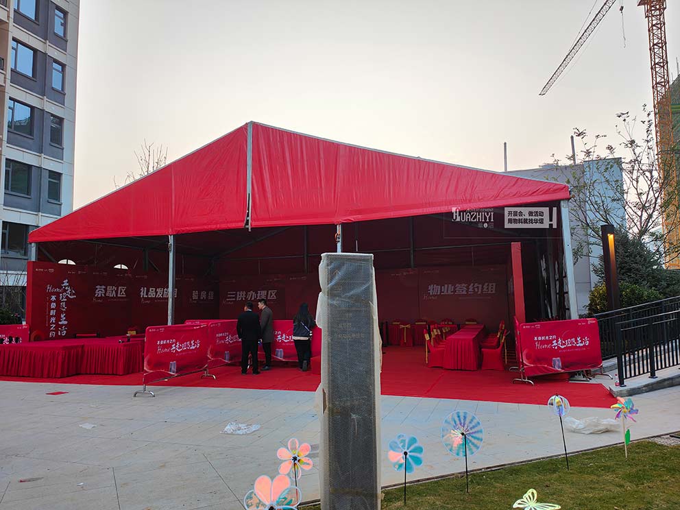 紅色篷房以其獨特的造型和鮮艷的色彩,成為了交房現場的一大亮點。篷房內部寬敞明亮,布局合理,為購房者提供了一個舒適、寬敞的選房和咨詢環境。同時,篷房外部的紅色裝飾與地產項目的整體風格相得益彰,為項目增添了濃厚的喜慶氛圍。